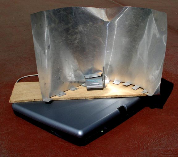 wireless router mounted in a 3 gal plastic pail with a foil reflector.